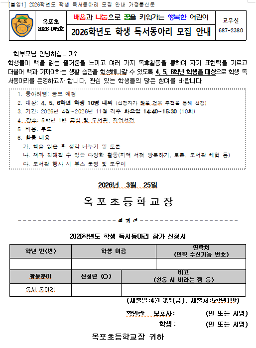 (2026-45)2026학년도 학생 독서동아리 모집 안내